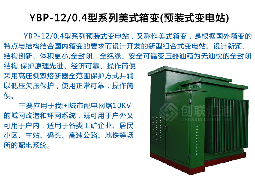 ●YBP-12/0.4型系列預(yù)裝式變電站,又稱作美式箱變,是根據(jù)外箱變的特點(diǎn)與結(jié)構(gòu)結(jié)合內(nèi)箱變的要求而設(shè)計(jì)開發(fā)的新型組合式變電站。